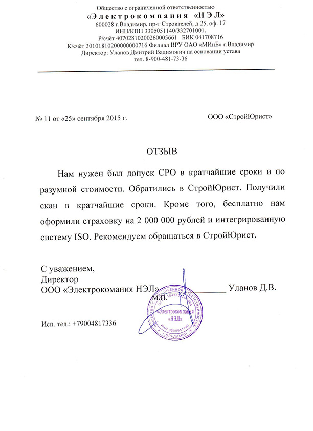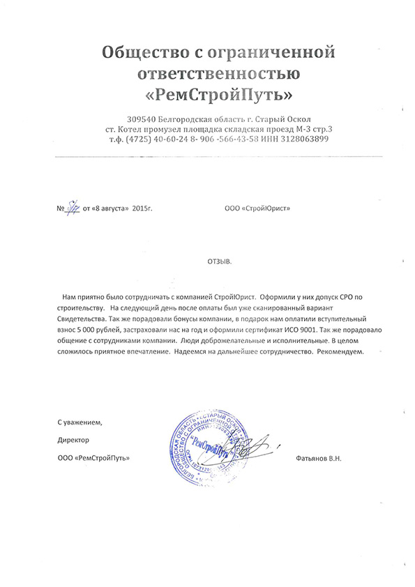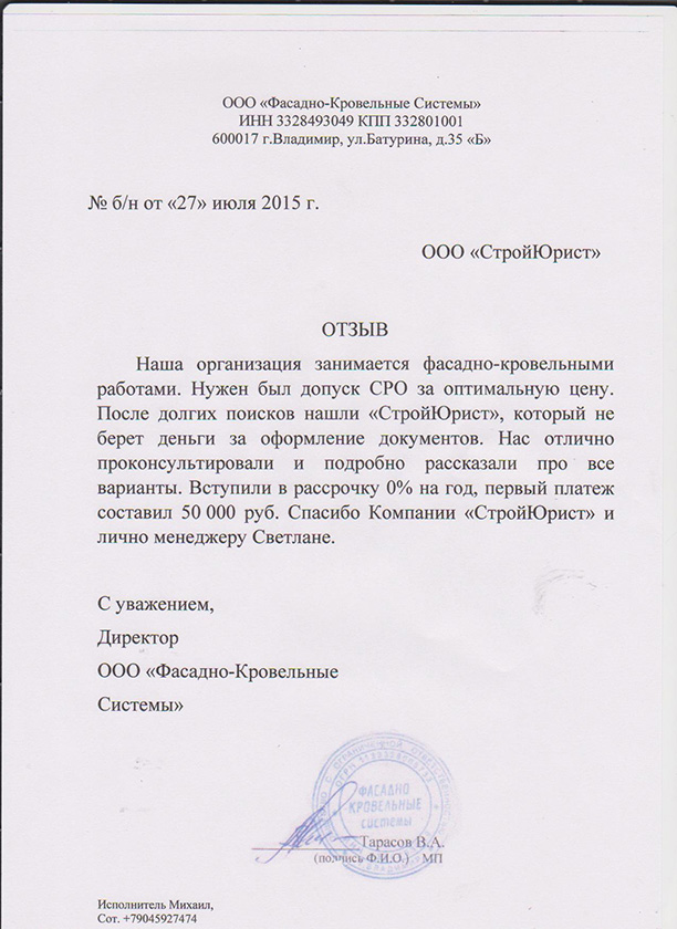 Отзывы клиентов "СтройЮрист" по вступлению в СРО в Зеленограде