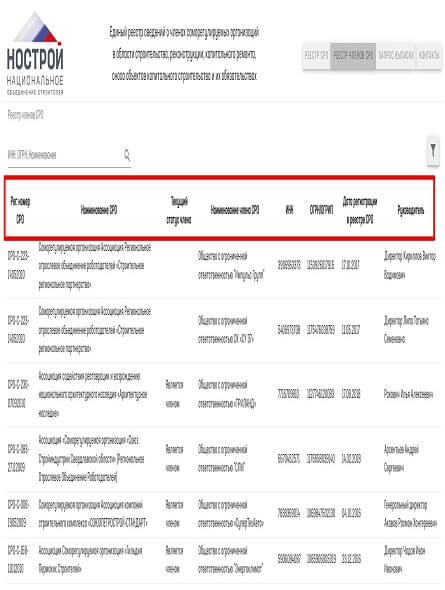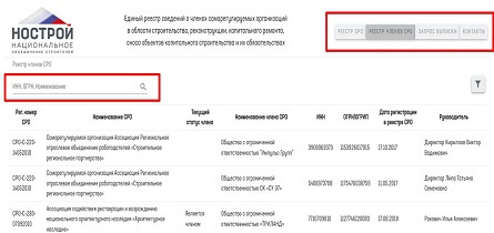 Откройте на сайте НОСТРОЙ Единый реестр. Чтобы проверить конкретную компанию, выбирайте вторую вкладку. Вы увидите строку поиска по ИНН, названию компании, ОГРН. В таблице отражены следующие данные стройфирм: